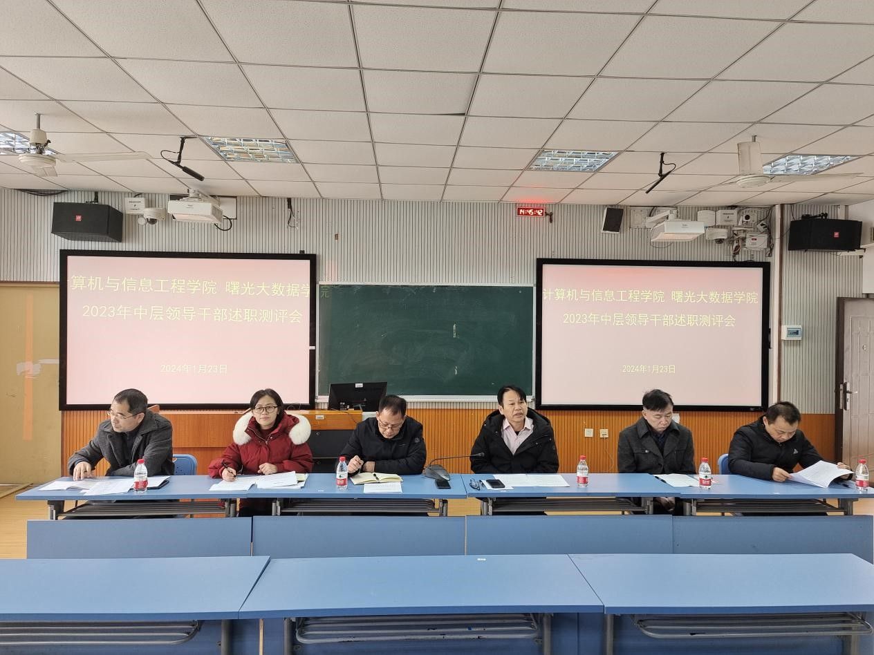1月23日,计算机与信息工程学院/曙光大数据学院在明秀校区文星楼315教室召开2023年中层领导干部述职测评会,学校组织部姜宁同志到场指导,学院领导班子和全体教职工参加,会议由学院党委书记余朝文主持。