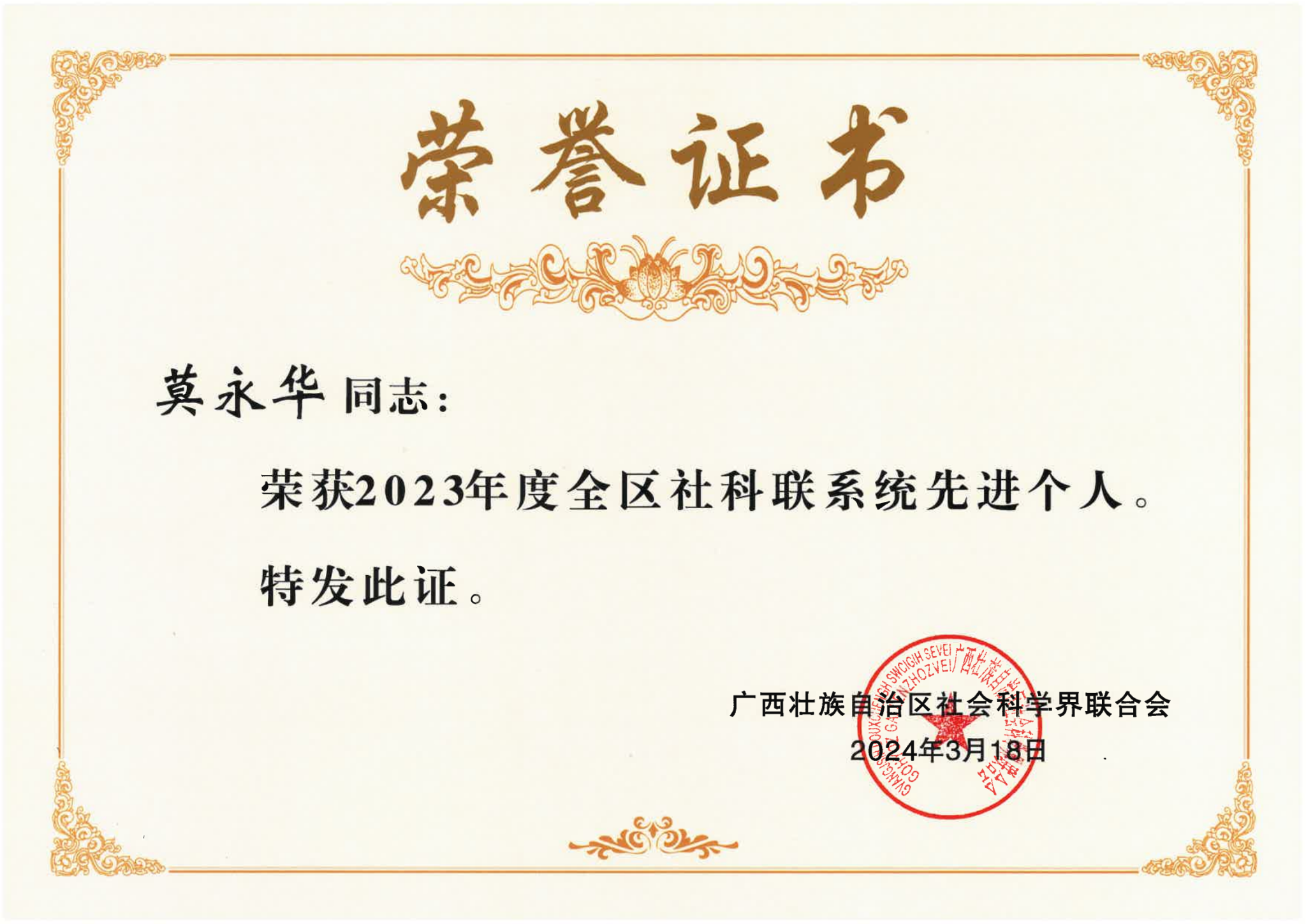 3月19日下午,自治区社会科学界联合会第九届委员会一次主席会、第九届委员会二次常委会、第九届委员会二次全委(扩大)会在南宁举行,自治区社科联第九届委员会主席、驻会和兼职副主席、常委、委员及各社会组织、高校社科联、市县社科联代表及区社科联各部门负责人及工作人员近200人参加会议。会议宣读了“自治区社科联关于表扬2023年全区社科联系统先进集体和先进个人的决定”,计算机与信息工程学院莫永华教授被评为“2023年全区社科联系统先进个人”