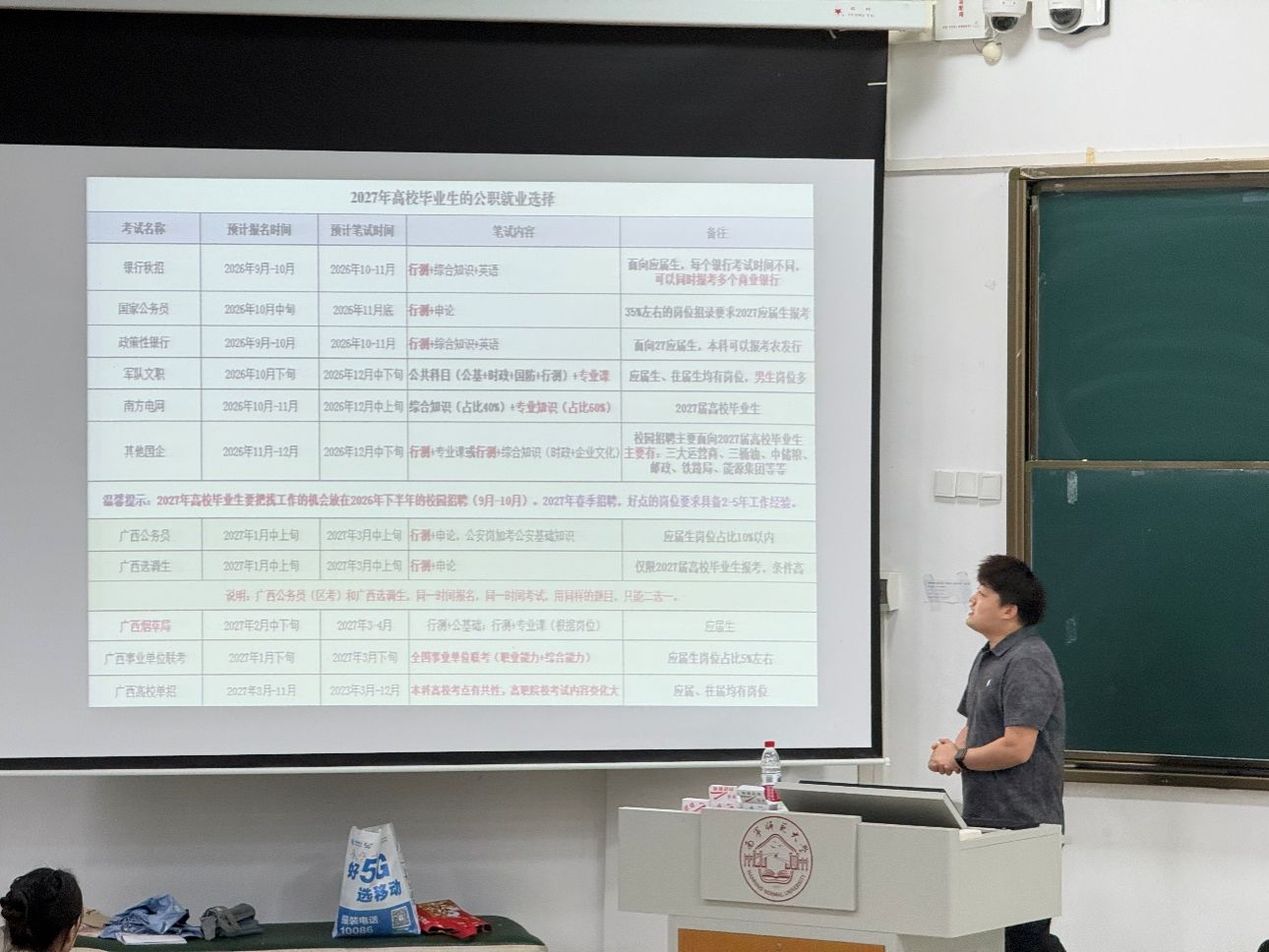 随后,肖老师钧泽重点解析了以2027届毕业生为核心的求职时间线。他强调,指出2026年9月至12月是求职“黄金期”,涵盖了银行秋招、国家公务员考试、政策性银行、军队文职、南方电网及其他国企招聘等关键招考。他提醒同学们务必提前备战,把握校园招聘主渠道。针对备考,肖老师钧泽分享了行测、申论等科目的学习策略与资源,并强调了目标规划与持续努力的重要性。